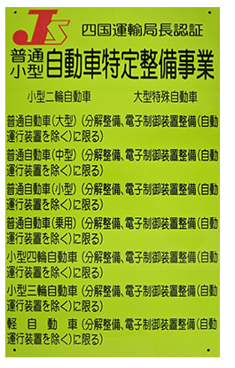 認証を受けた整備工場の入口付近には、左のような黄色又は若草色の看板を掲示しておりますので、点検整備を依頼される時には必ずご確認ください。